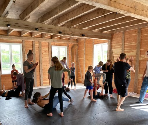 Under yogasalen ligger dansesalen. Her er højt til loftet og ingen skråvægge, så her kan vi have aktiviteter som kræver mere plads, som eksempelvis akrobatik og dans. Her er plads til ca, 30 personer. I rummet er der vinduer hele vejen rundt og ligesom i yogasalen har dansesalen en smuk udsigt udover søen.